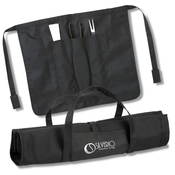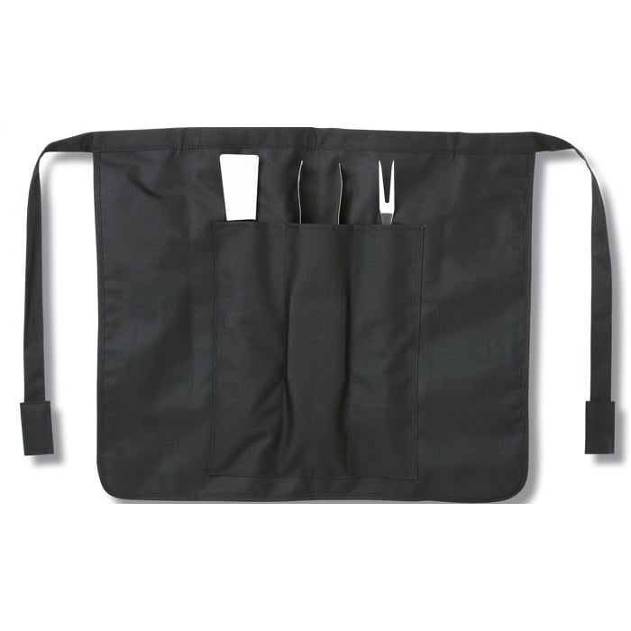 - Basic BBQ set includes three stainless steel tools (grilling fork, tongs and spatula) and a durable black canvas apron.