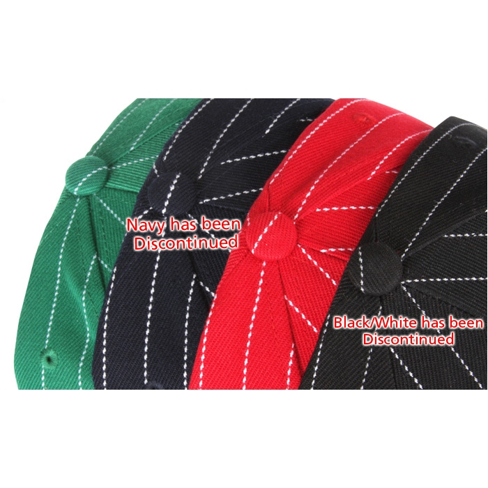 - Green, navy, red, and black caps are accented with white pin stripes.