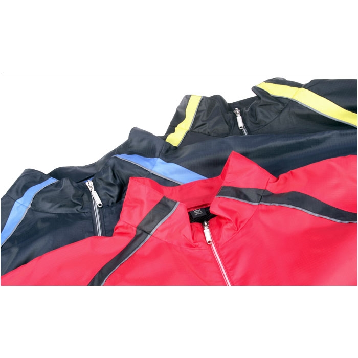 - Jacket body color is nicely complemented by platinum piping and contrasting stripes at the armholes.