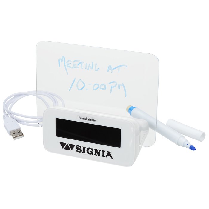 - Also features an LED memo board with a write on and wipe off dry erase pen (included).