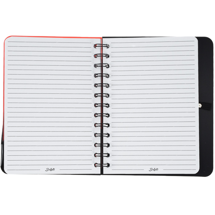 - Front and back notebook covers are bound with black wire binding.