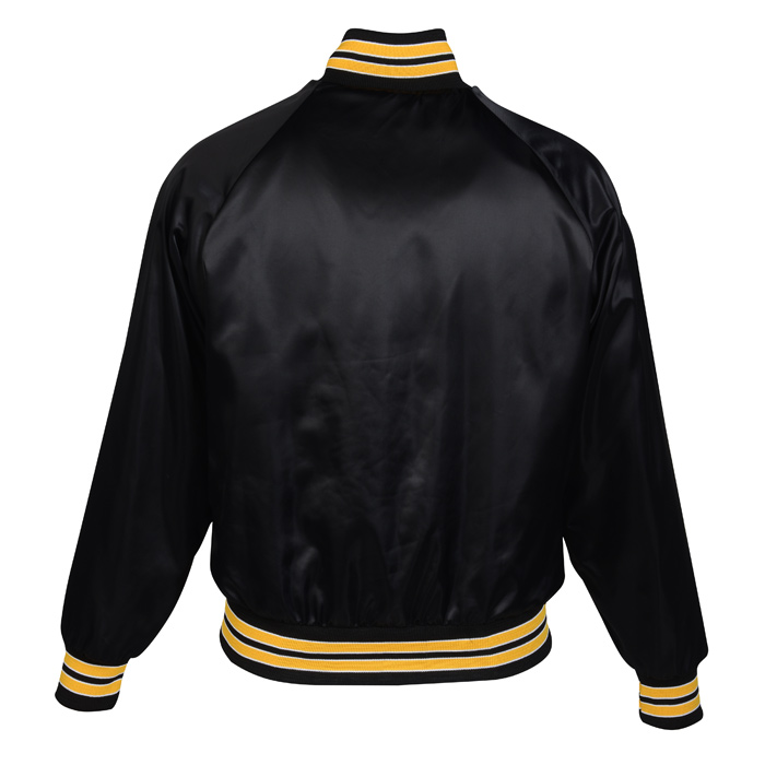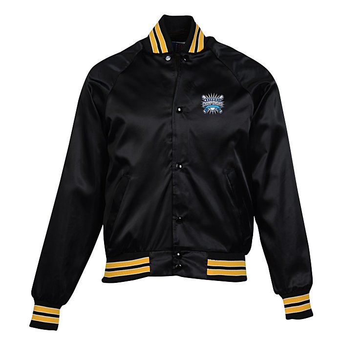 - This baseball jacket is designed with a 100% nylon satin shell with a 100% poly-flannel lining for long-lasting wear.