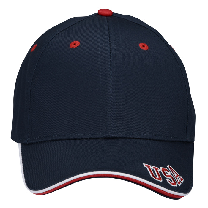 - Stylish caps are navy with red eyelets, a red top button and red and white contrast piping on the sandwich visor.