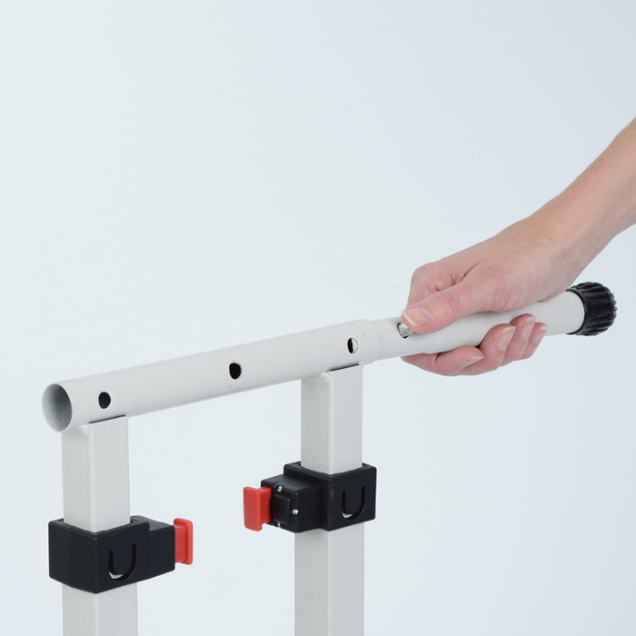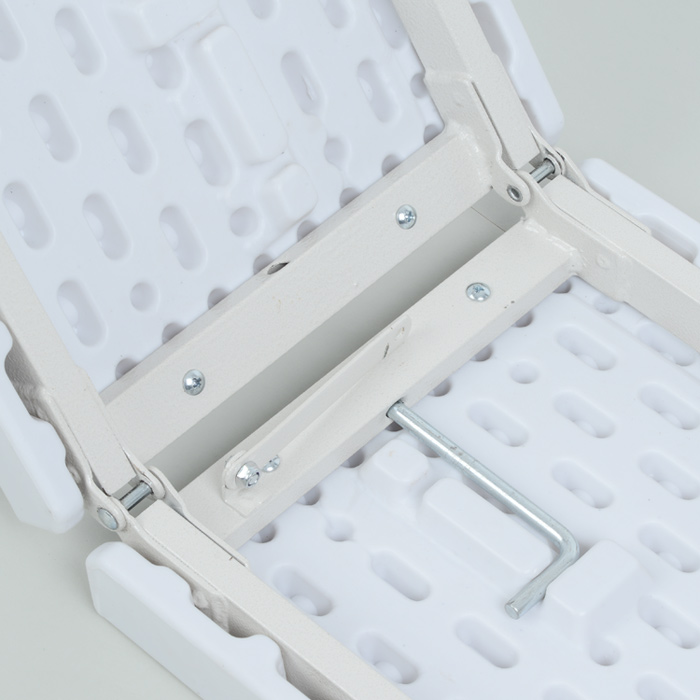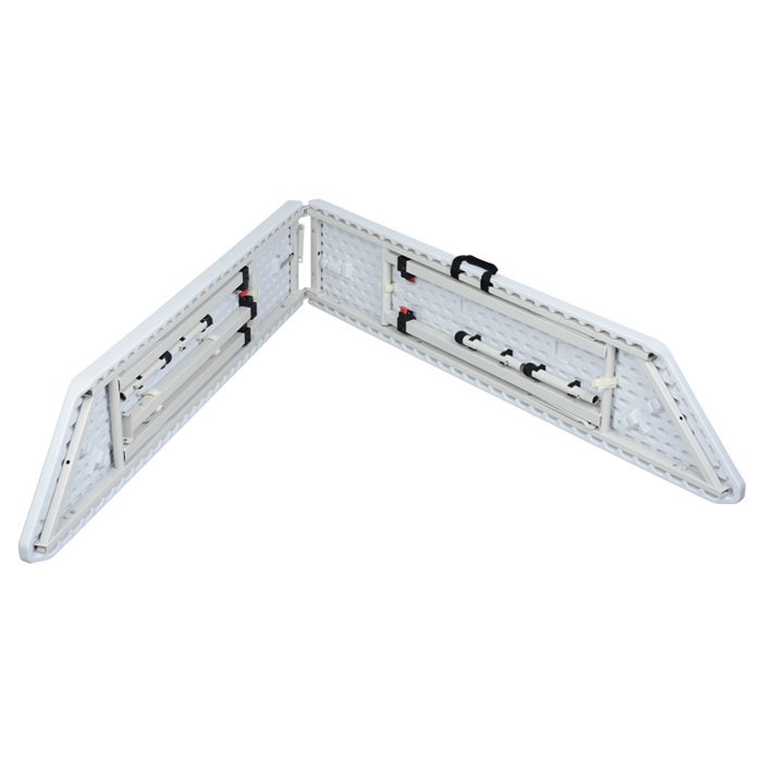 - Kit includes: a display counter, almond-colored steel legs and a table throw.