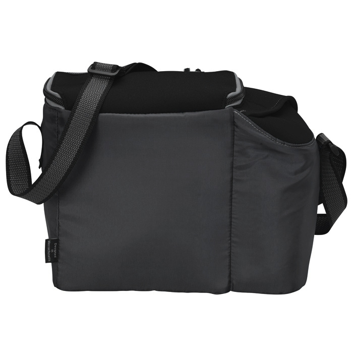 - Separate side compartment can hold a bottled or canned beverage.