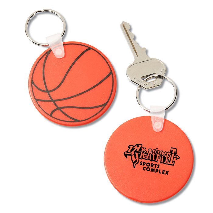 - Standard basketball-design graphics appear on the back of this vinyl tag with silver split ring for keys.
